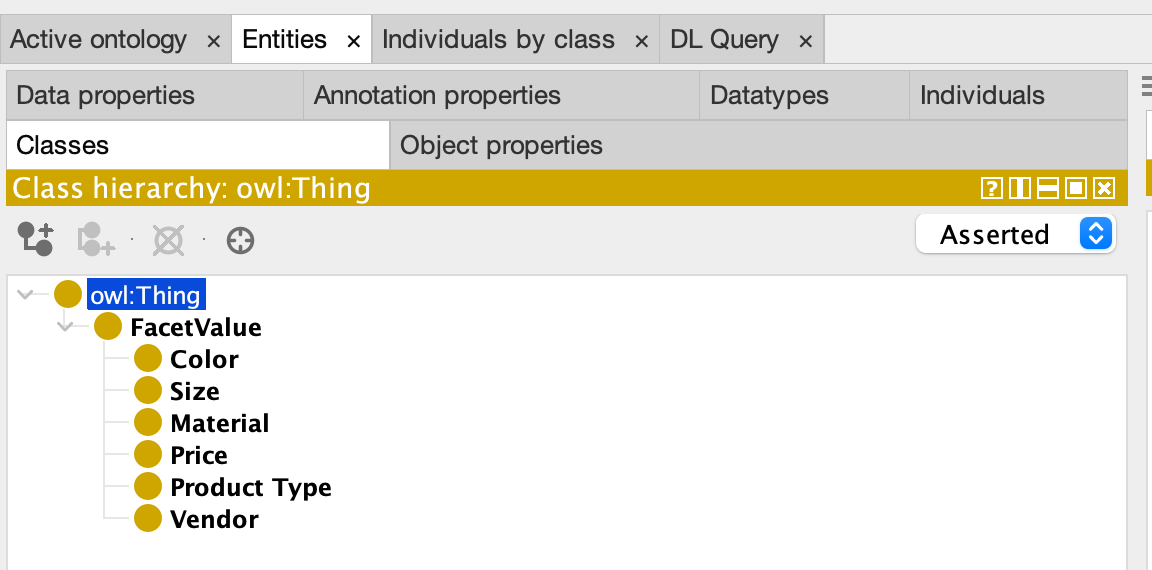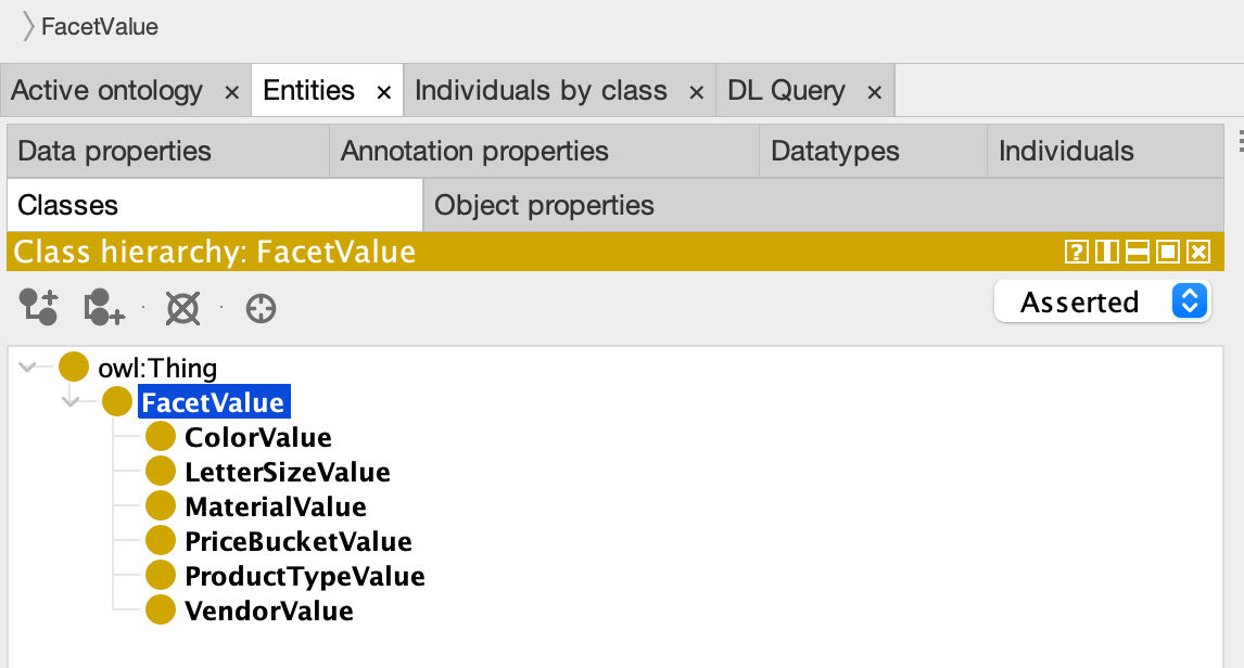 Shows the underlying ontology identifiers (“FacetValue”, “ColorValue”, “MaterialValue”, etc.) for developers and internal users