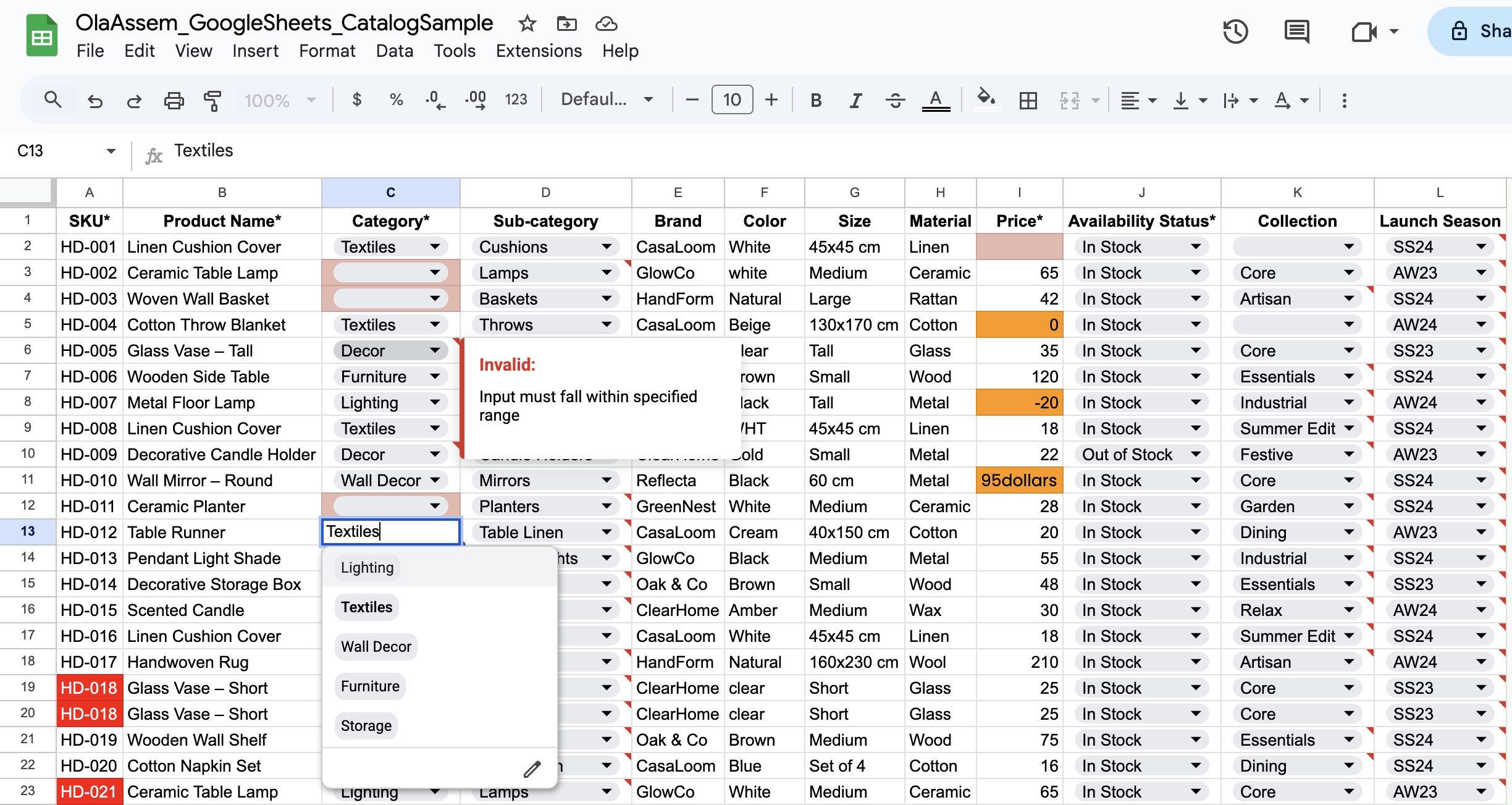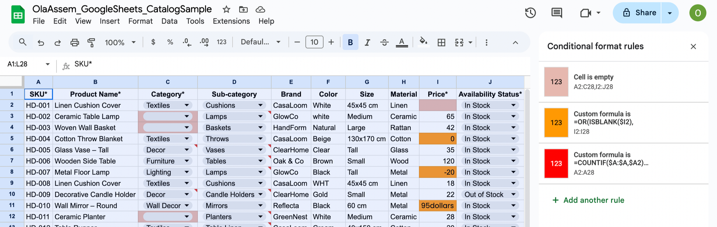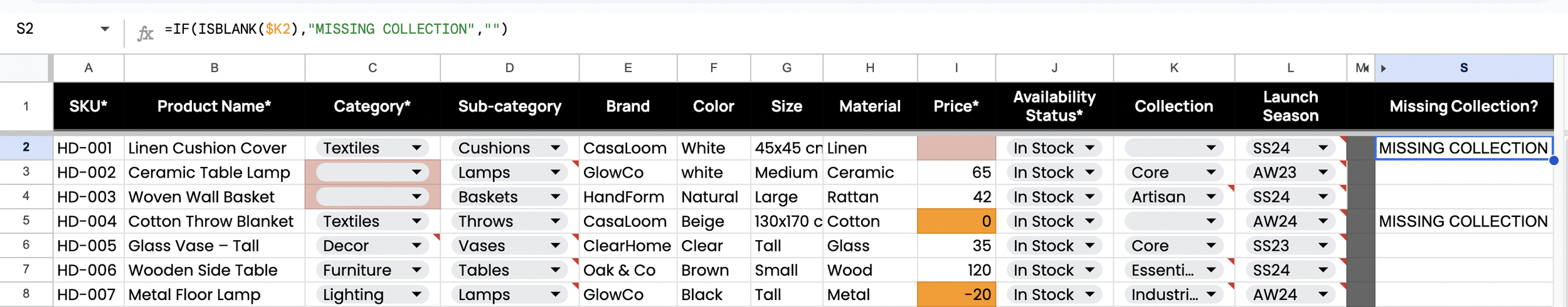 This section shows how I audit a working product catalog for common QA issues using Google Sheets checks. The goal is to surface problems that block clean merchandising and publishing—duplicate SKUs, invalid reference values, missing required fields, and pricing errors—so they can be reviewed and resolved systematically.