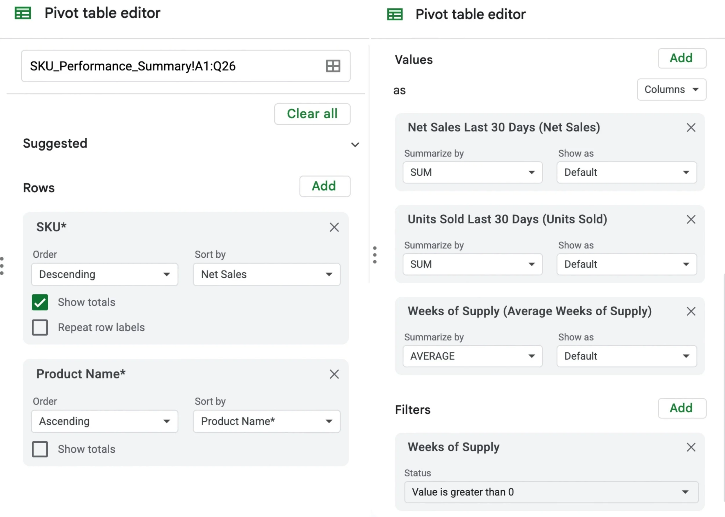 This pivot table produces an action list by filtering for low Units Sold and high Average Weeks of Supply. This highlights SKUs that may need markdowns, re-merchandising, or reduced reordering.