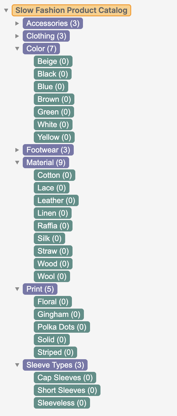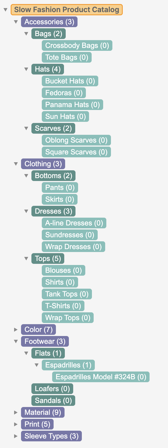 The taxonomy represents a curated product catalog for a hypothetical slow fashion brand, featuring a limited yet strategically selected range of categories, attributes, and relationships.