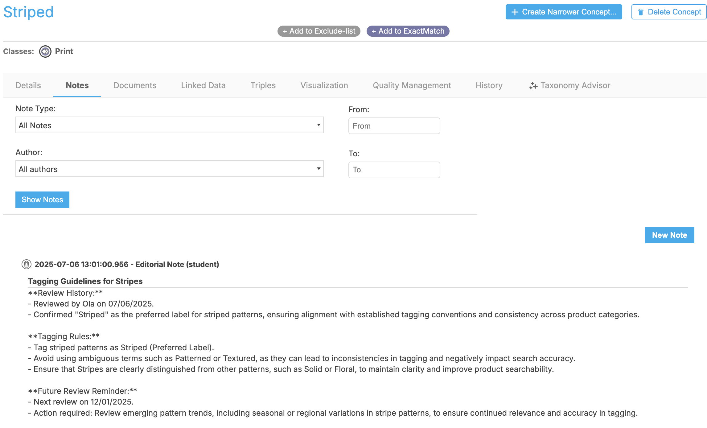 The Notes field was used to simulate governance-related metadata, including tagging rules, review history, and future update reminders. This reflects how enterprise taxonomies are maintained over time to ensure consistency and clarity in tagging conventions.