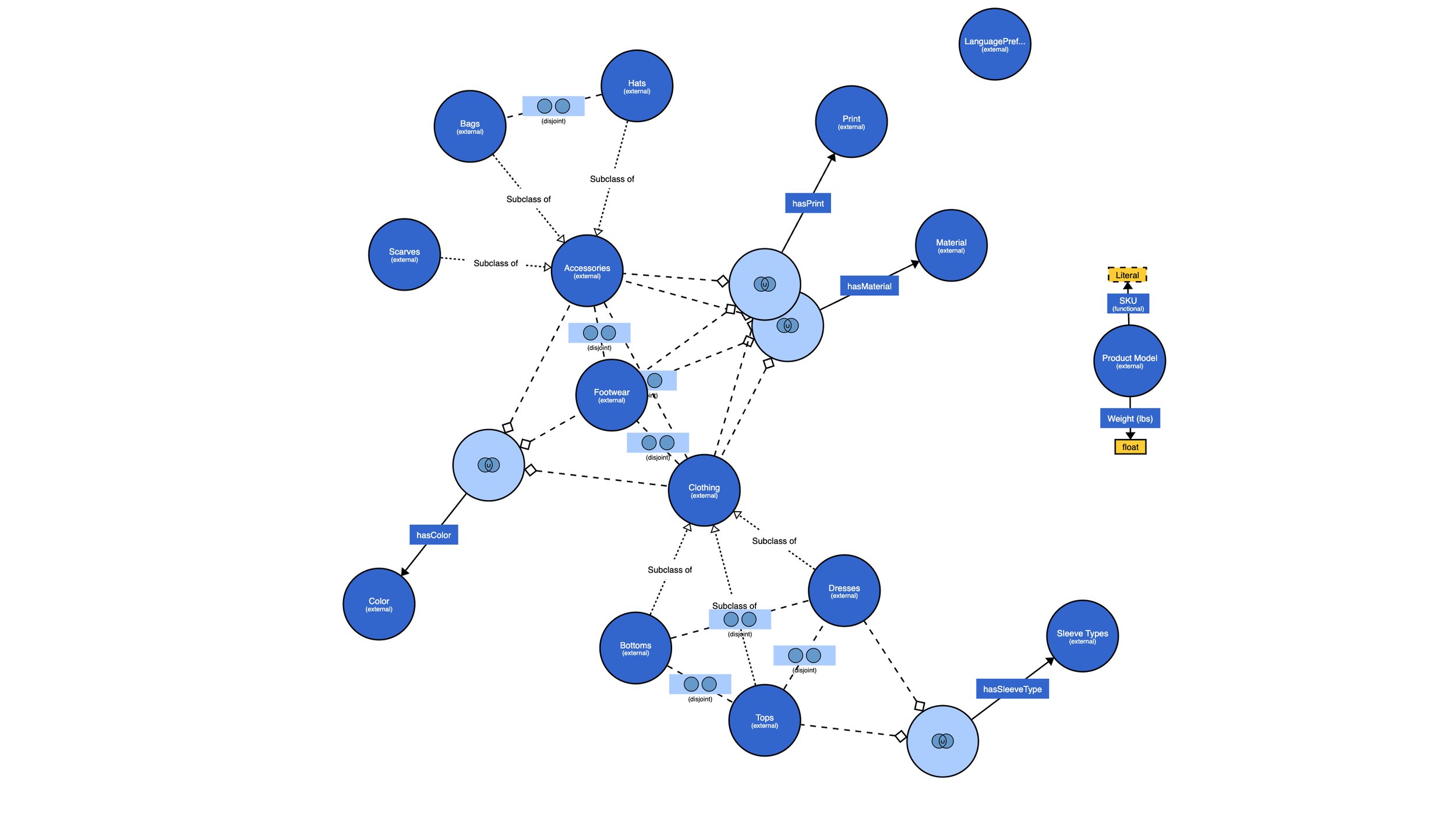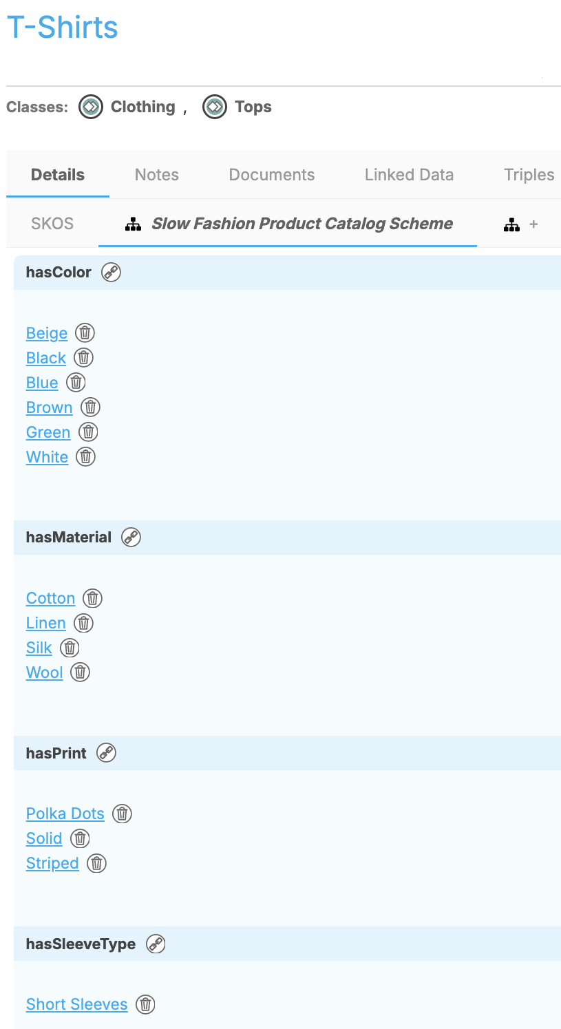 Color,Material,Print, andSleeve Typeswere modeled as separate concept schemes and linked to product classes via custom ontology relations (e.g.,hasColor,hasMaterial).Each attribute was defined as a controlled vocabulary to support precise tagging, filtering, and scalable expansion.