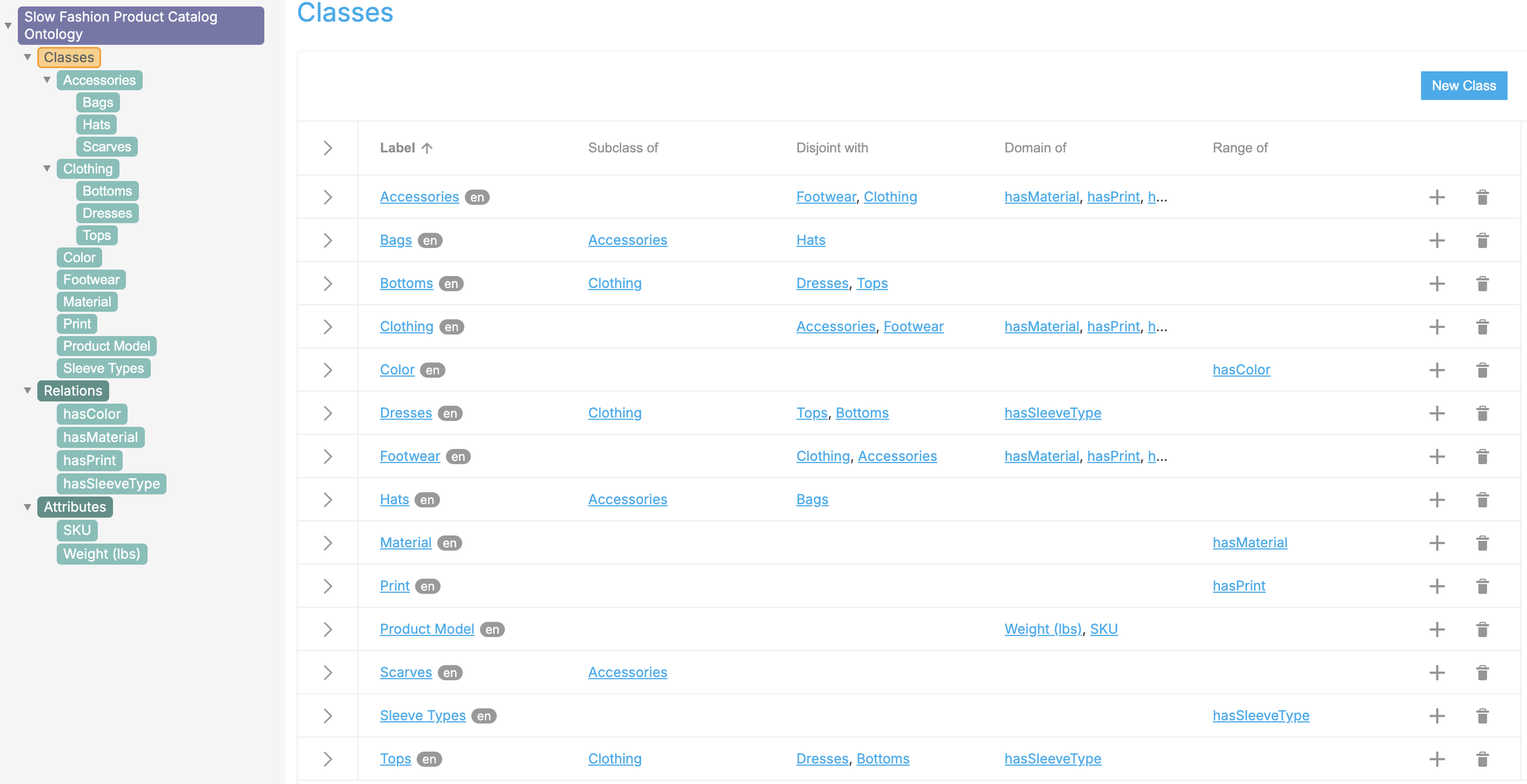 Subcategory concepts inherited the classes of their broader categories and, in some cases, belonged to multiple classes simultaneously (e.g., T-Shirts linked to both Clothing and Tops). This multi-class modeling was managed through ontology class links rather than SKOS hierarchy, preserving semantic integrity and SKOS compliance.
