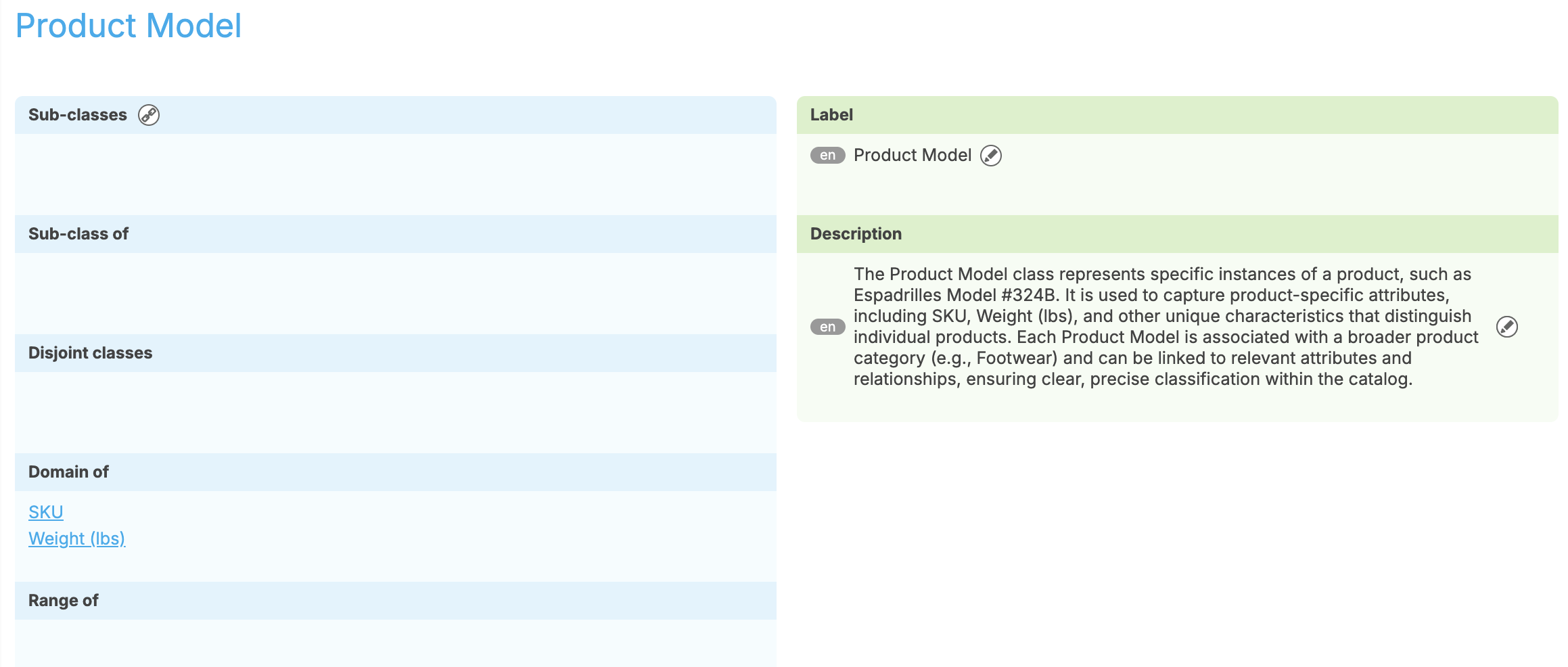 SKUand weight) to be applied only to product models, while general categories likeEspadrillesremain abstract and unburdened by instance-specific fields. This preserves semantic clarity while demonstrating readiness for PIM-level data modeling.Portfolio Value: